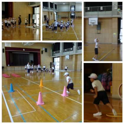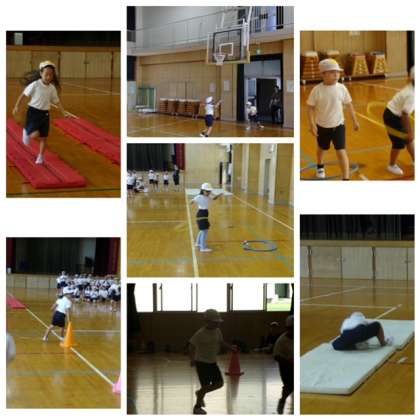 けんけん、コーンを回る、輪っかを回す、シュートに前転、各コーナをまわっていきます。