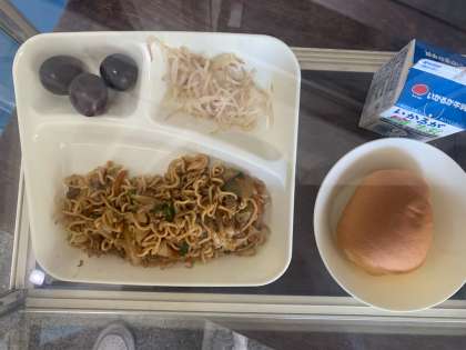 ミニコッペパン 牛乳 オイスターソース焼きそば もやしのしょうがづけ ぶどう(巨峰)