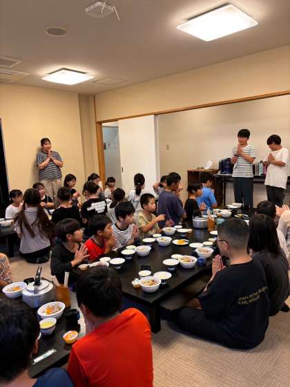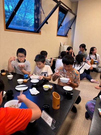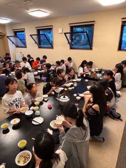 一日目夕食の鴨鍋。鴨のだしと新鮮な野菜の甘みが溶け込み最高なお味。一日目の活動でおなかをすかしていたのか、もりもり食べていました。ごはん、鴨鍋のおかわりもあり、みんな満足そうにしていました。