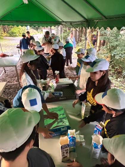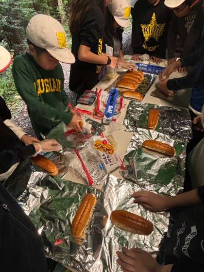 朝からカートンドックつくり!!パンにソーセージ、チーズを挟んで、牛乳パックに入れて燃やします!!上手にできるかな。
