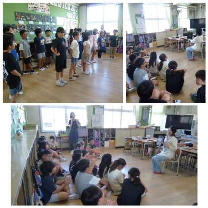2学期も火曜日はとしょぼさんが読み聞かせに来てくれています。みんなしーんとして聞き入っています。