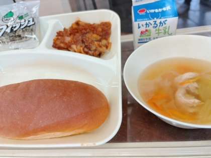 なすのミートグラタン 鶏肉とキャベツのスープ ミニフィッシュ 黒糖ぱん、牛乳