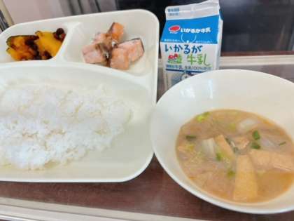 さけの塩焼き みそ汁 かぼちゃのいとこ煮 ごはん,牛乳