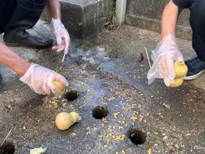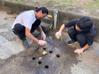 R先生とYさんが、くさいけれど、外側のうす皮をはがし、中に残っていた種をきれいに取り除いてくれました。
