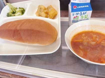 白身魚フリッター ミネストローネ ブロッコリーのサラダ 黒糖パン、牛乳