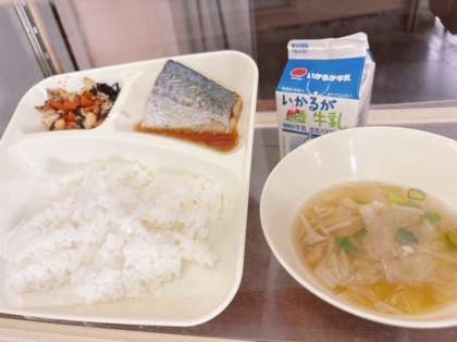 さごしのごまじょうゆかけ すまし汁 大豆の煮もの ご飯,牛乳