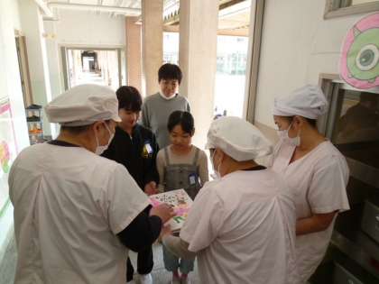 「いつも、ありがとうございます。」と児童からのお礼に、調理員さんからも「みんなで読ませてもらいますね、ありがとう。」と言って受け取ってくれました。