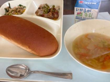 豚肉のオイスターソース焼き 中華スープ ツナとチンゲンサイの炒めもの 黒糖パン、牛乳