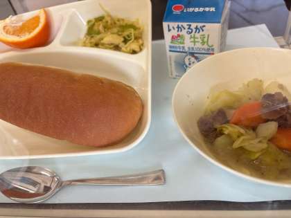 ポトフ カレーソテー いよかん 黒糖パン、牛乳
