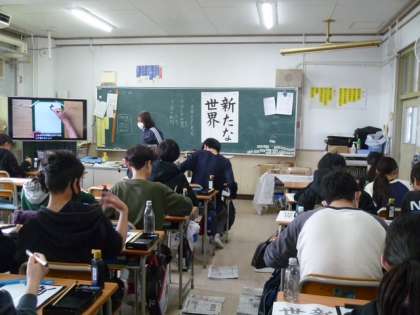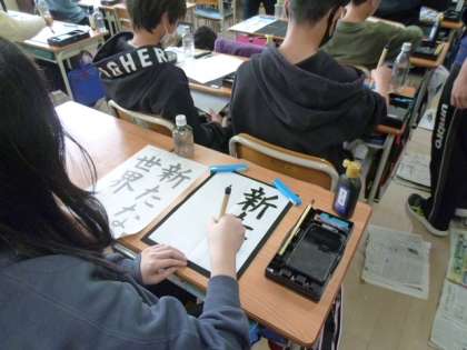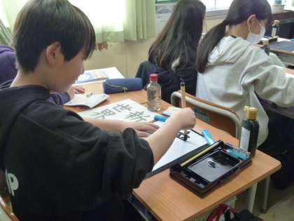筆の使い方に気をつけて、お手本を見ながら書いています。