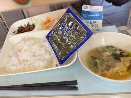 キンパ(焼きのり) 卵の中華スープ ごはん、牛乳