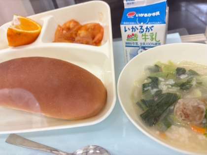 えびのチリソース炒め 中華がゆ デコポン 黒糖パン、牛乳