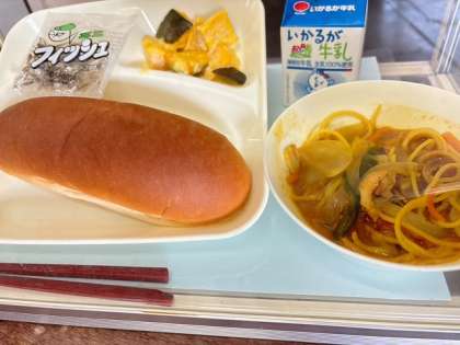 カレースープスパゲッティ かぼちゃのマリネ焼き ミニフィッシュ 黒糖パン,牛乳