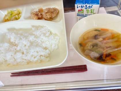 鶏肉の竜田揚げ 五目汁 キャベツの梅風味 ごはん、牛乳