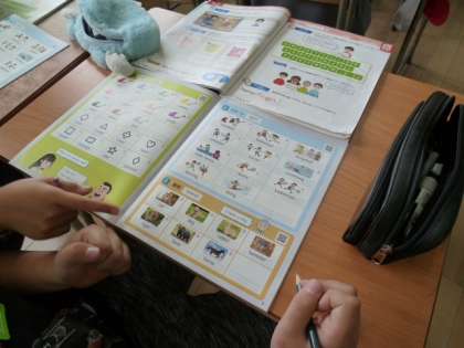 色、動物、スポーツ、食べ物、くだもの、いろいろな中から好きなものを選んで印をつけました。次の時間は、選んだ好きなものを英語で答えます。