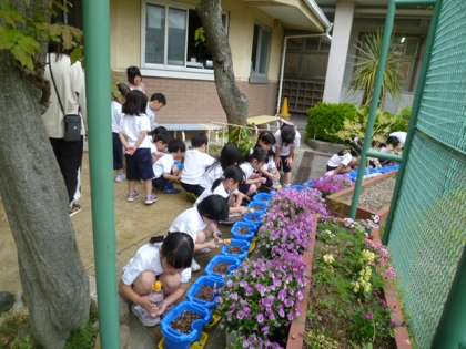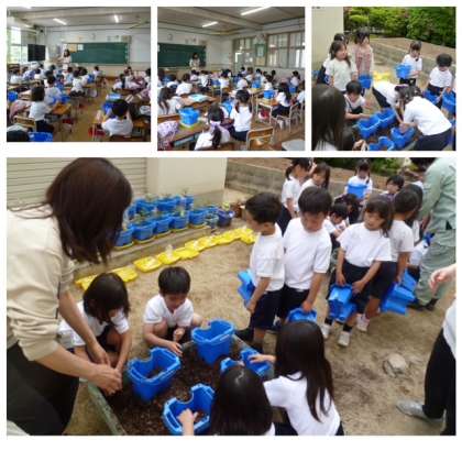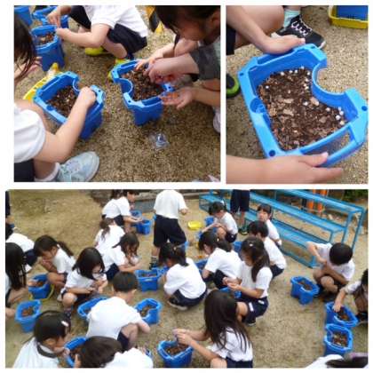 まず、管理作業員さんが用意してくれた土を植木鉢に半分くらい入れ、穴を開けてあさがおの種を入れます。そして土を加えて肥料をのせ、たっぷり水をあげました。