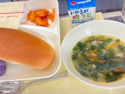えびのチリソース 中華スープ スライスチーズ コッペパン、ブルーベリージャム、牛乳