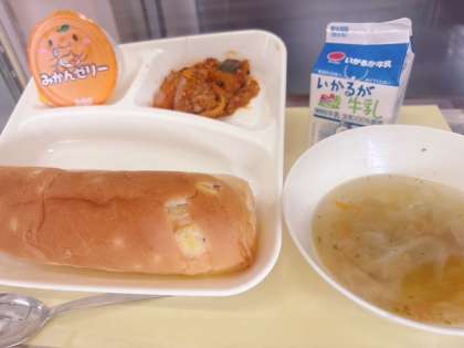 かぼちゃのミートグラタン スープ みかんゼリー おさつパン、牛乳