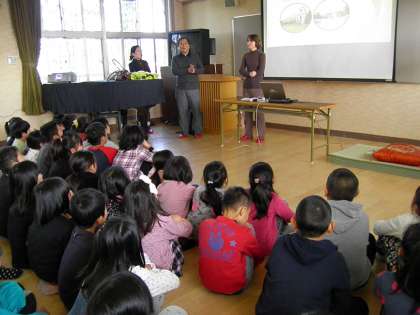 11月22日(金)に大阪市立大学からお二人の先生をお迎えして、3・4年生と5・6年生の子どもたちが、イギリスの話を聞かせていただきました。リー先生はイギリスから日本に来られています。イギリスの家・住宅の様子を話してくださいました。また、落語にも興味をお持ちで、英語の落語を聞きました。「しゃぶしゃぶ弁当」というお話で、雨の音や楽しい身振りに子どもたちはおおはしゃぎでした。ありがとうございました。