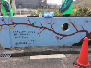 2月27日月曜日の2限〜4限、遠里小野公園の壁面に全校児童の手形で大きな木の絵を描きました。これは本校が今年の10月に創立80周年を迎えることに関わる記念地域学習の一環で、遠里小野公園愛護会・大阪市建設局長居公園事務所の皆様のご尽力により実施することが可能となりました。当日はグリーンコーディネイターはじめ多くの地域の方々にもお世話になりました。ありがとうございました。
