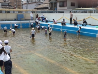 6月3日土曜日、土曜授業として「ふれあい参観」を実施しました。どの学年もたくさんの保護者の方々が積極的に参加してくださり、楽しく盛り上がりました。写真は、3年生理科「水辺の生き物をさがそう」のプールの中の生き物探しと、6年生体育「親子スポーツ大会」でのキックベースボールのようすです。