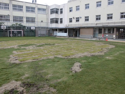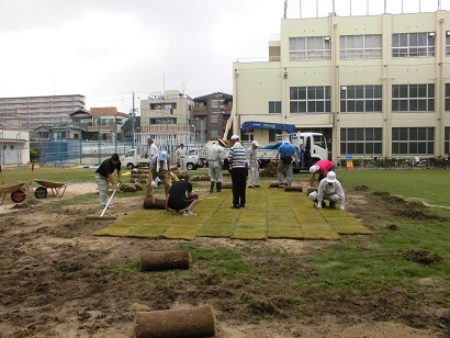 7.29 おりおの地活協芝生部会の皆様や地域のボランティアの皆様、また、住吉区役所の方々にも来ていただき、校庭の芝はりをしていただきました。暑い中、遠里小野の子どもたちのために本当にありがとうございます。夏休み明けにはまたきれいな芝生の運動場が見られるのが楽しみです。