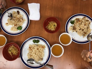 鉢高原での最後の食事は、炊き込みご飯と卵スープです。では、手を合わせて感謝の気持ちを込めて、い・た・だ・き・ま・す!