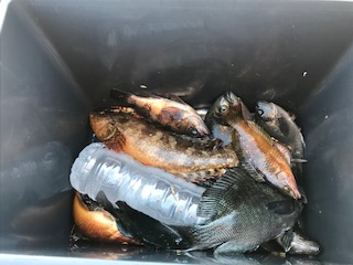 本日の釣果。餌とりのフグがけっこう釣れましたが、調理できないので全部リリース。あれ?これはチヌ?