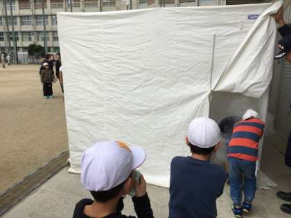 11月11日土曜日、防災学習の一環として住吉区総合防災訓練に参加しました。校庭に1次避難したあと大和川中学校に2次避難し、縦割り班に分かれて防災体験学習をしました。給水訓練、土のう作り体験、煙ハウス体験、水消火器による消火訓練、起震車による地震体験をそれぞれ実施しました。起震車では震度4と7を体験し動くことができないほどのゆれの大きさに驚きました。写真は土のう作り・煙ハウス・水消火器による消火訓練のようすです。その後学校に帰って保護者引き渡し訓練を行いました。関係諸機関の皆様、地域の皆様、保護者の皆様には大変お世話になりました。ありがとうございました。