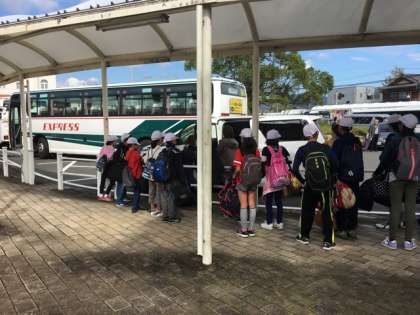 志摩磯部到着。大きな荷物を預けて今からバスでスペイン村に向かいます。乗り物酔いはありません。