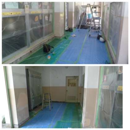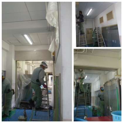 調理室が終わって、給食室の児童だまりの壁もきれいにしてくれています。