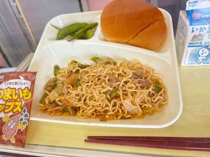 焼きそば えだまめ おさつチップス ミニコッペパン、牛乳
