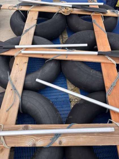 朝から用意してもらったお弁当を食べて、いかだ作りに取り組みました。