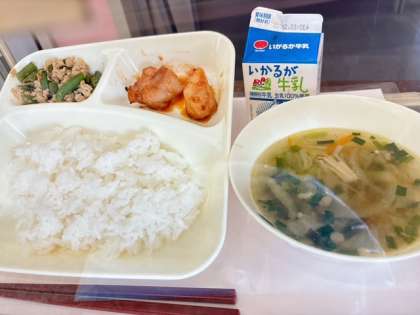 鶏肉のチリソース焼き 焼き豚のスープ ツナと三度豆のの炒めもの ごはん、牛乳