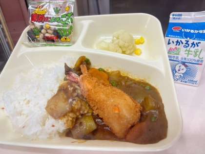 えびフライカレーライス カリフラワーのピクルス 豆こんぶ ごはん、牛乳