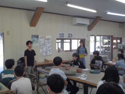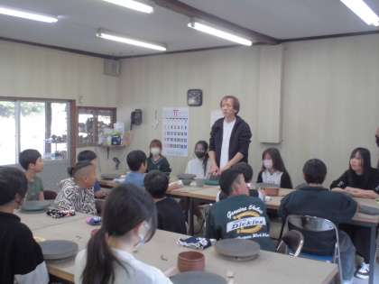 信楽にやってきました。ここで陶芸体験です。宗陶苑のスタッフの方から作り方を聞いています。