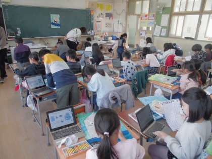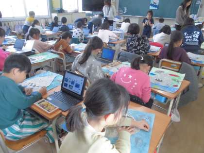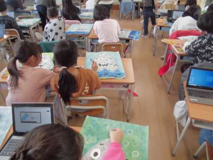 ちぎった新聞紙を張り付けて、大きな魚を描きました。海の底に広がるのは、なにかなぁ・・・