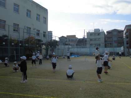 片方の手になわを持って回し、とぶタイミングを練習しています。