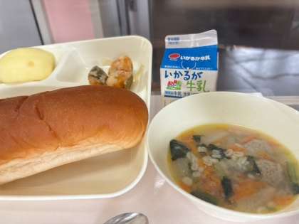 さけのマリネ 肉だんごと押麦のスープ りんご 黒糖パン、牛乳