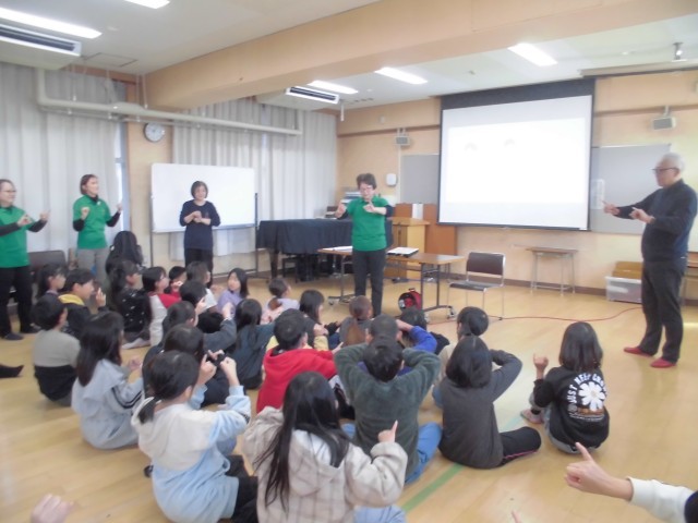 小さいころに耳が聞こえにくくなったHさんやボランティアの方がきて、耳の聞こえない人が使う手話や困りごとなど、いろいろなお話をおしえてもらいました。