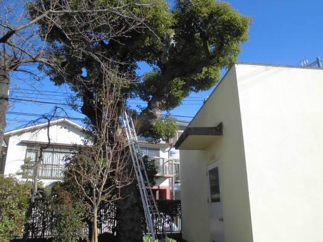 日頃は、管理作業員のKさんがきれいにしてくれていますが、梯子で登らないと届かない高いクスノキなどは、危険作業のためできません。園芸班の方が、安全対策をして伸びた枝をきれいにしてくれました。