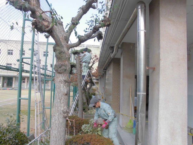 営繕園芸班の方たちが来て、学校の樹木剪定をしてくれました。