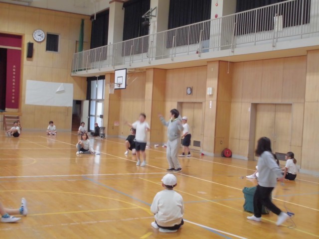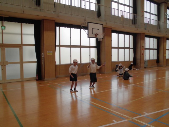 2人組で、お互いの縄の一方を持って一緒に跳んだり、片方がもう一人を中心に回りながら跳んだりしていました。
