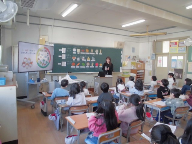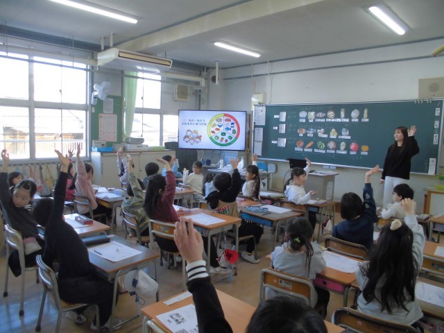今日の給食の献立の材料が、「黄・赤・緑」のどの栄養になるのか、クイズもしました。