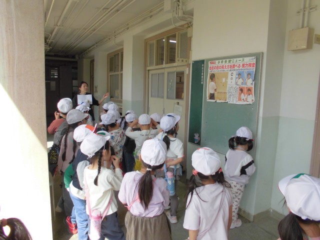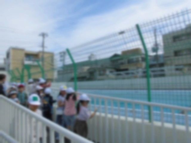 学校の探検をしました。大きなプールを見て、みんな大はしゃぎ。6月中旬から水遊びが始まります、楽しみだね。