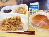 オイスターソース焼きそば もやしの中華あえ ぶどう(巨峰) ミニコッペパン、牛乳