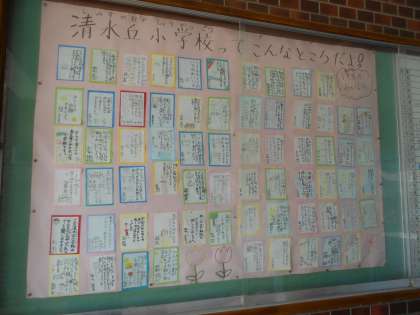 今月の玄関掲示は6年生の作品です。「清水丘小学校ってこんなところ」と題して、新しく清水丘の仲間になった皆さんに学校を紹介してくれています。来校された際に、ぜひご覧ください。