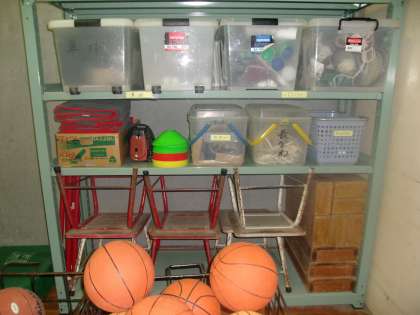職員作業で体育館の体育倉庫をきれいにかたづけました。皆さんの使い勝手がいいように、よく使うものは手前に、使わないものを奥に入れました。また、出し入れがしやすいように入り口付近を開けています。わかりやすいように、写真付きで説明しています。