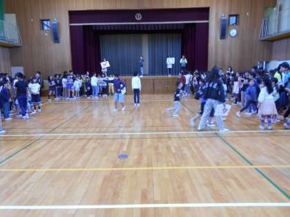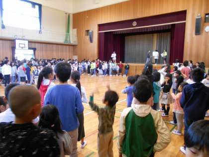 今朝のフレンド集会は〇×クイズでした。問題の答えをフレンド班で相談し、〇ゾーンと×ゾーンに移動して答えました。