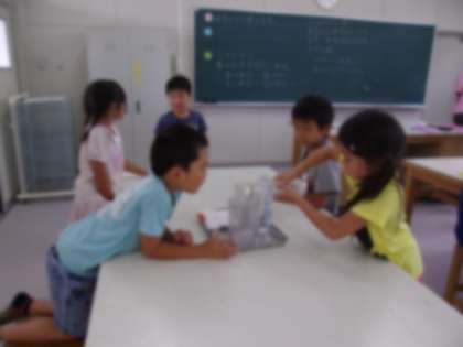 先生の説明を聞いて、ノートを書いて、作業に入りました。ケンカをしないように、順番を守って、ペットボトルの中の水のかさを比べました。真剣な顔が良かったです。